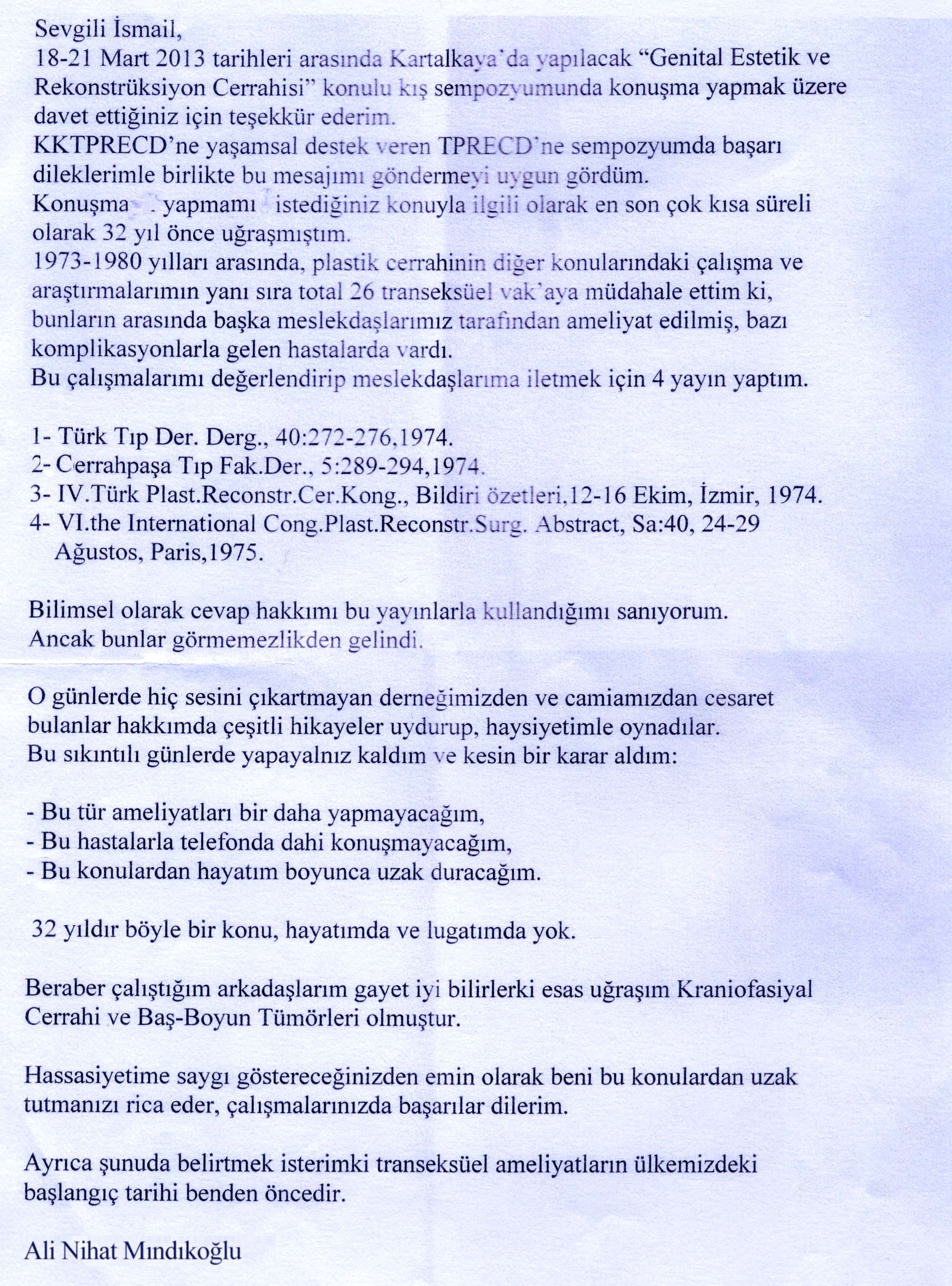Yıllar sonra bir sempozyuma davet ve cevabı Prof. Dr. İsmail Kuran’ın Genital Estetik ve Rekonstrüksiyon Cerrahisi Sempozyumu’na davet mektubu: Prof. Dr. Ali Nihat Mındıkoğlu’nun cevabi yazısı: